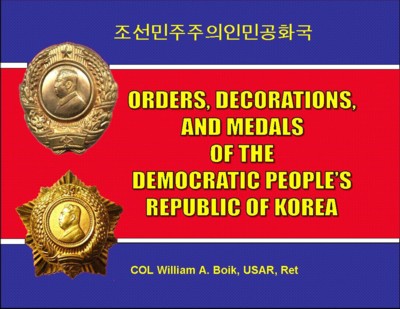| NKMB1. ORDERS, DECORATIONS, AND MEDALS OF THE DEMOCRATIC PEOPLE'S REPUBLIC OF KOREA by COL William A. Boik, USAR, Ret. Hardcover with dust jacket. 11" x 8.5", having 120 pages illustrated with over 300 color photos showing all North Korean awards. $37.95 |