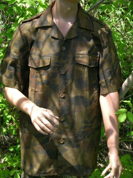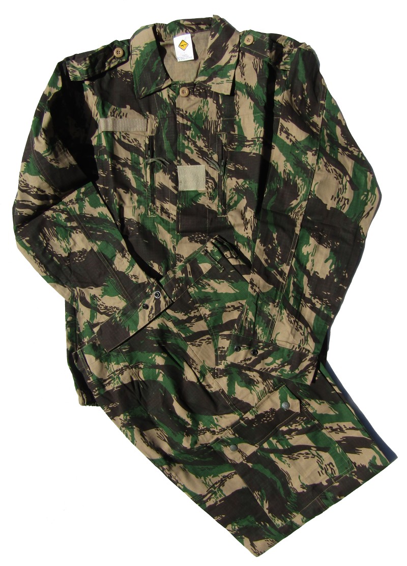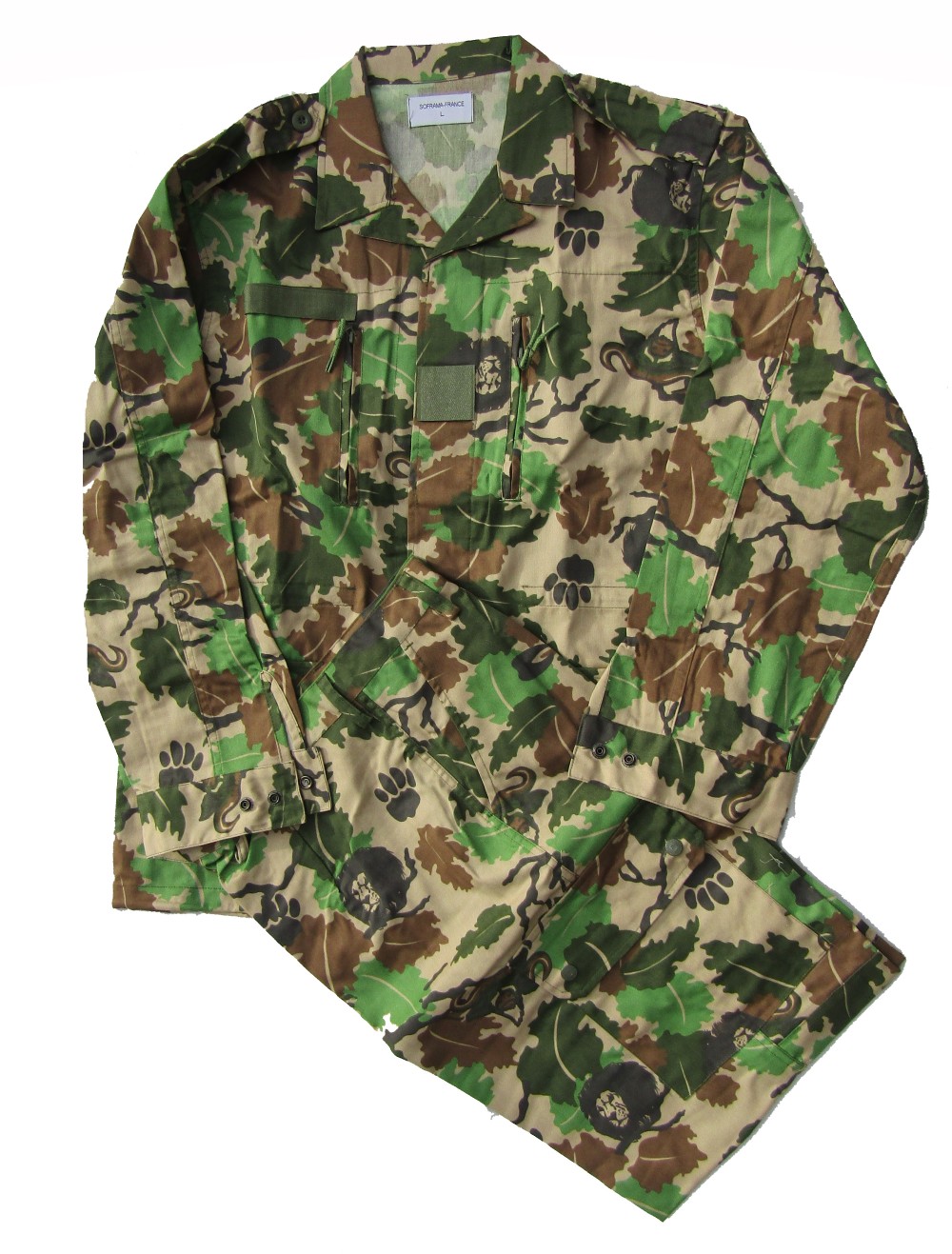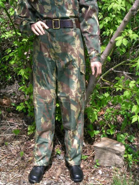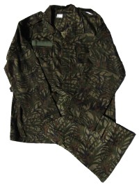 AN1. Angolan Army Leaf pattern camouflage sets. Shirt is button up with 2 front vertical zipper pockets , 2 lower patch pockets. Pants are zip up with 2 front pockets, 2 cargo pockets. Fabric is a twill material. Available in sizes Large and XL . $119.95