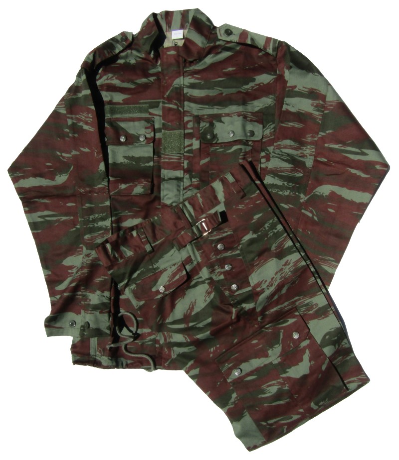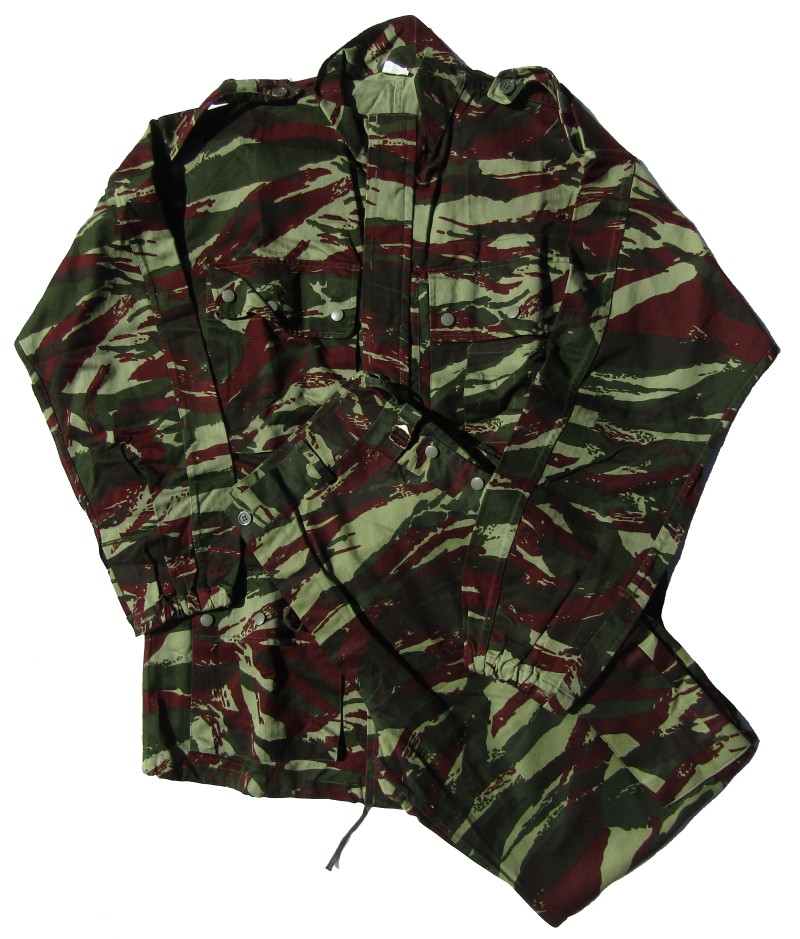 BENIN1. Benin French Lizard Camouflage Set Size 104/108 Jacket has 2 upper and 2 lower pockets, pants have 2 front snap pockets, 2 back pockets, 2 cargo pockets jacket