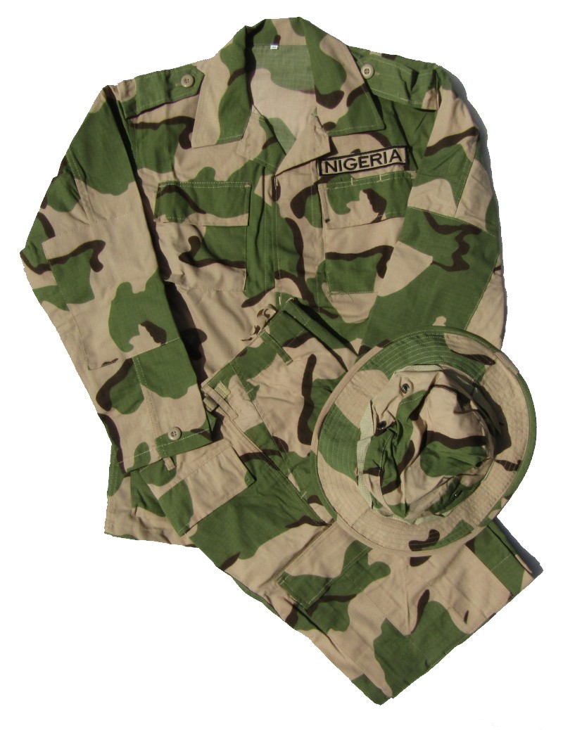 NIGERIA1.Nigerian Army camouflage BDU set size medium Jacket has 2 upper and 2 lower pockets, pants have 2 front pockets,