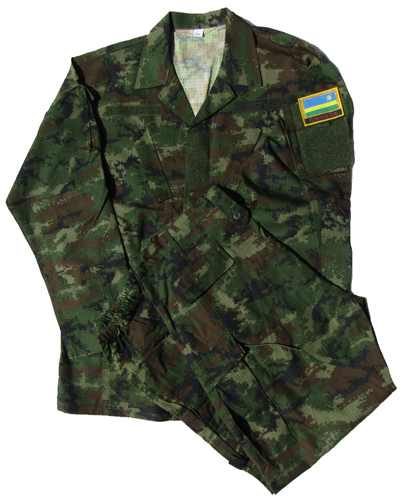 RDF1.Rwanda camouflage uniform. Pants have 2 front pockets,2 cargo pockets, 2 lower leg pockets,