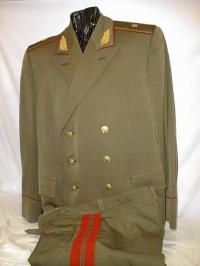 everyday uniform. Jacket,breeches,visor.Jacket has red piping around cuffs and collar, gold embroidered leaves on collar.Large ribbon bar including ribbons for 2 Orders of Lenin.Breeches have red general stripes.Visor has red piping and gold embroidered wreath around Generals kokarde.This rank was used from March 1958 to 1973. About size 58-4.$800.00 |