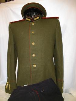 everyday uniform. Complete with jacket,breeches,and visor.Jacket has purple piping around cuffs and collar,gold embroidered leaves on collar.Breeches have purple generals stripes.Shoulder boards have embroidered marshal star and embroidered Signals device. Size 58-4. $950.00 |