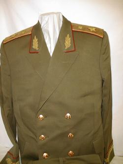 insignia. Shoulder boards have the large embroidered green embroidered Marshal star with embroidered Soviet coat of arms.Breeches are olive with red generals stripes.With visor.ribbon bar.$950.00 |