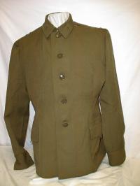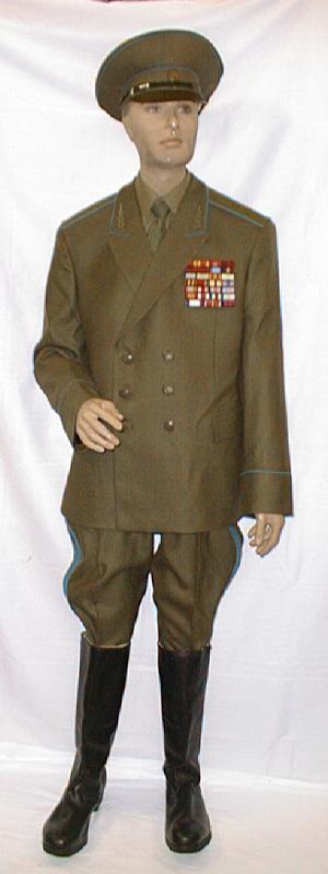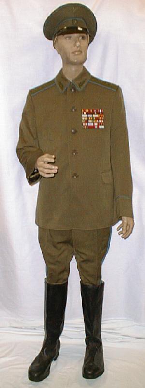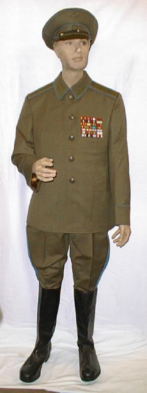 service uniform (jacket, breeches, visor). Jacket is open collar with blue piping around collar and cuffs, subdued plastic buttons, green thread embroidery on collar, large ribbon bar. Shoulder boards are olive wth 1 large embroidered star with blue outline and embroidered winged propeller in green thread. Breeches are olive with blue stripes.General visor is olive color with olive bill and olive chincord, and subdued generals cocarde. About size 58-4. $850.00 |