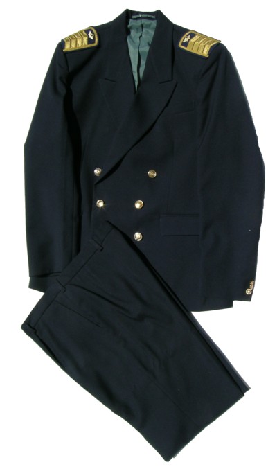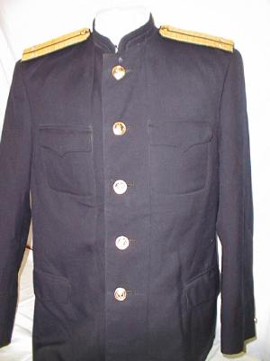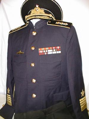 everyday uniform.Jacket, pants,visor.Closed high collar tunic with gold bullion stars on each lower sleeve and Admiral stripes on each sleeve,large ribbon bar.With black pants and visor. |