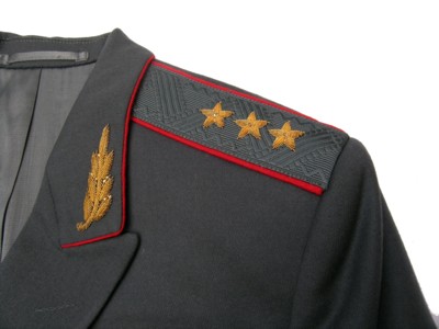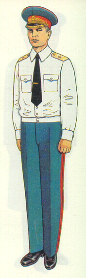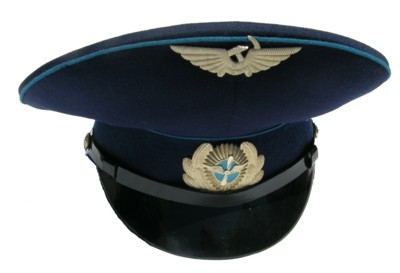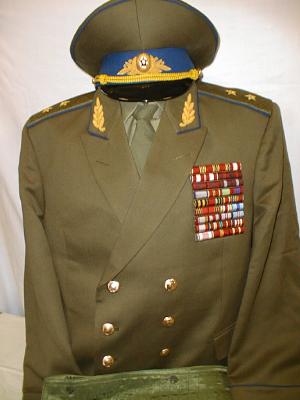 everyday uniform. Complete with jacket,pants,and visor.Jacket has light blue piping and gold embroiderd leaves on collar.Pants have light blue generals stripes.Shoulder boards have embroidered marshal star with gold embroidered wreath and embroidered winged propeller.Size 56-4.$950.00 |