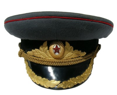 walking out uniform. Jacket,pants,visor.Grey jacket has red piping and gold embroidery on collar and around cuffs,shoulder boards are gold with red underlay and has the large embroidered gold Marshal star with embroidered Soviet coat of arms,large ribbon bar.Pants are dark blue with red generals stripes.Grey visor with red band and red piping with gold embroidery. $1,500 |