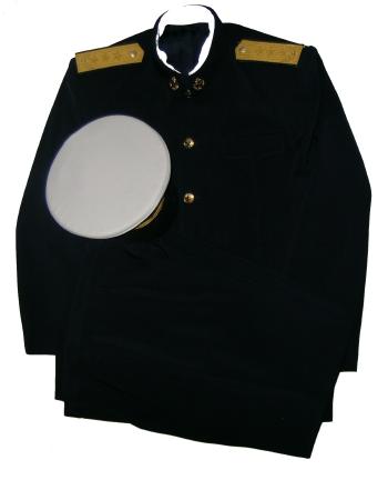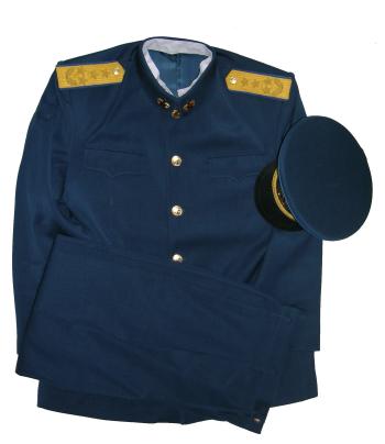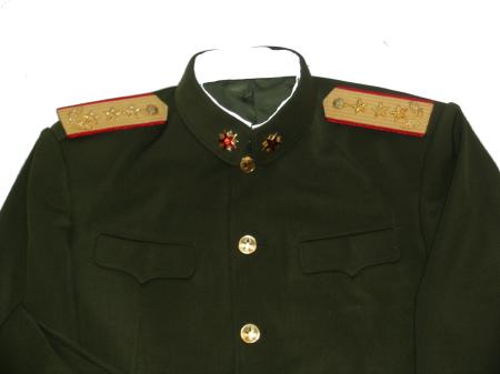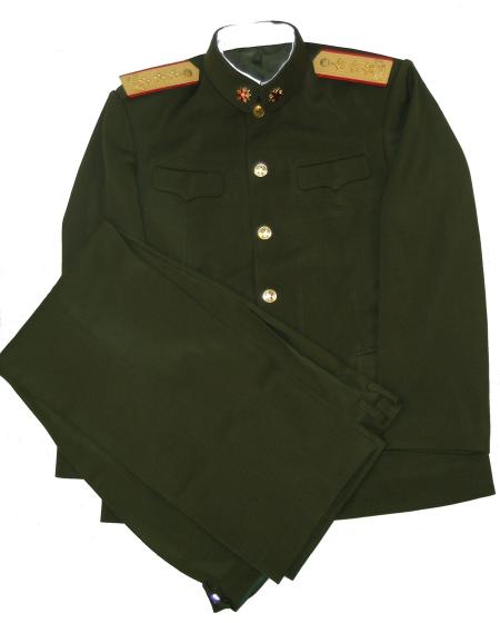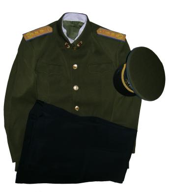 uniform. Includes jacket,pants,hat. Nice heavy fabric, well marked. Have hat sizes 58,59. Shoulder boards have 3 embroidered gold stars and wreath. Size of the jacket is 44-46, pants 38" waist. $475.00 Beautiful uniform. Also available in Jacket size about 42 ", waist size 36" |