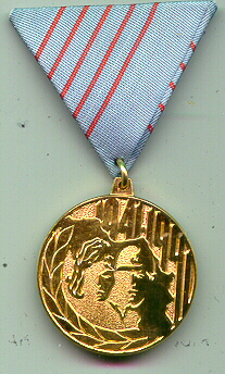 Medal of National Merits. Inscription in Roman Script. Gilded bronze; with pentagonal ribbon on a metal base. With ribbon bar.$15.00 YM142A.Yugoslav Medal of National Merits. Inscription in Roman Script. |