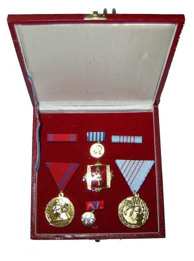 and insignia set in a special display leatherette case, which contains: Medal of the 40th Anniversary of the Yugoslav People's Army, Medal of the 50th Anniversary of the Yugoslav People's Army, Badge of the General Staff Academy, Miniature of the Medal of Bravery and Miniature of the Order of Merit to the People. In perfect condition. $125.00 |